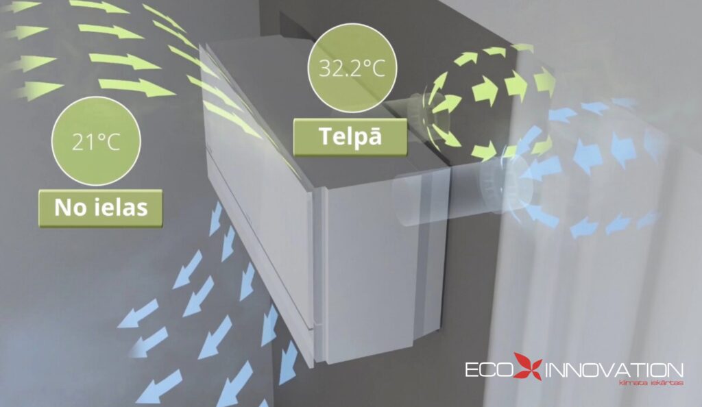 Energoefektivitāte: Rekuperācijas ventilācijas sistēma ļauj ietaupīt enerģiju, jo siltums no izplūdes gaisa tiek pārnests uz iepūšamā gaisa plūsmu, tādējādi samazinot nepieciešamību pēc apkures.
