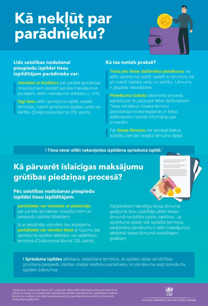 Ja ar piedzinēju vienoties nevar, parādniekam ir tiesības vērsties tiesā ar lūgumu par sprieduma izpildes atlikšanu vai sadalīšanu termiņos. Parādniekam labvēlīgs tiesas lēmums būs pamats tiesu izpildītājam atlikt izpildu darbības lietā.