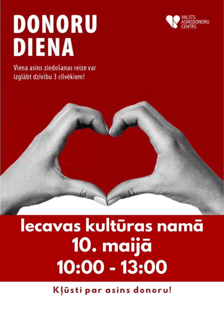 Sestdien, 10. maijā, Iecavas kultūras namā no pulksten 10 līdz 13 norisināsies Donoru diena, portālu informēja Valsts asinsdonoru centrā (VADC). Šobrīd VADC īpaši aicina atsaukties 0- un B- asinsgrupas donorus.