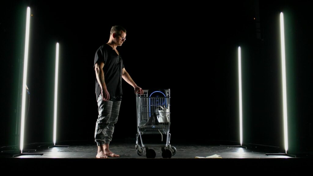 Vienīgās «mēbeles» šajā liftā ir nez kur gadījušies iepirkuma ratiņi un skanda. Uz kurieni ar liftu grasījās doties izrādes varonis? Kāda iepirkuma ratiņiem ir saistība ar varoņa dzīvesstāstu? Kas patiesībā šajā stāstā ir pats lifts? Kādēļ tas apstājās un kādēļ neviens nesteidzas atpestīt iesprūdušo cilvēku? Tie ir tikai daži no jautājumiem, kurus šajā absurdajā, vienlaikus smieklīgajā un pārdomas raisošajā stāstā risina varonis.