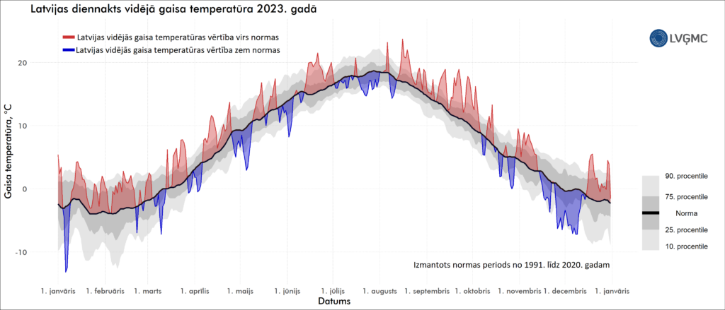 44 dienās vidējā gaisa temperatūra valstī bija vairāk nekā piecus grādus virs normas, 1.janvārī un 22.septembrī pakāpjoties pat 7,8 grādus virs tās. Savukārt piecus vai vairāk grādus zem normas vidējā gaisa temperatūra pērn bija 17 dienās, viszemāk noslīdot 6.janvārī, kad tā bija 10,4 grādus zem ierastā līmeņa.