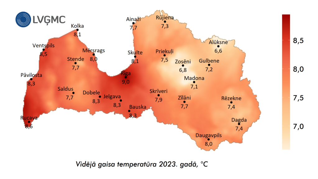 Vissiltākais 2023.gads bija Rīgas centrā, kur vidējā gaisa temperatūra sasniedza +9,0 grādus, visvēsākais tas bija Alūksnē, kur gada vidējā temperatūra bija +6,6 grādi.