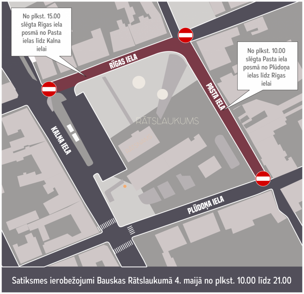 No pulksten 10 satiksmei būs slēgta Pasta iela posmā no Plūdoņa ielas līdz Rīgas ielai. Savukārt no pulksten 16 transportlīdzekļu kustība būs liegta Rīgas iela posmā no Pasta ielas līdz Kalna ielai. Bauskas Kultūras centrs atvainojas par sagādātajām neērtībām.