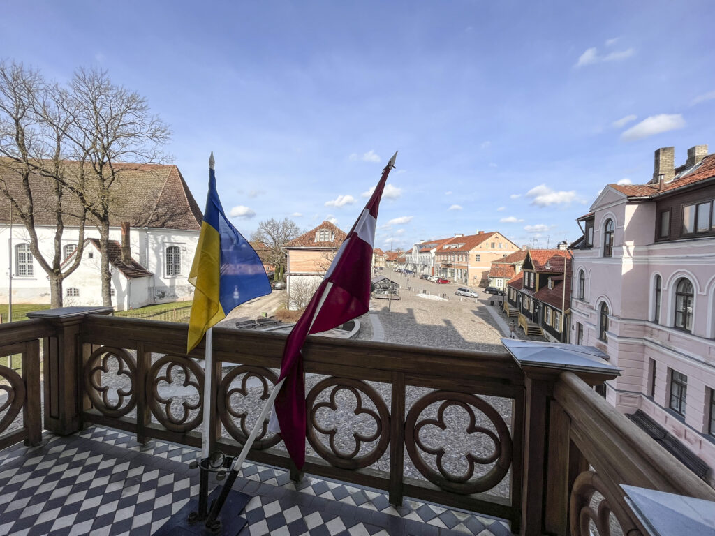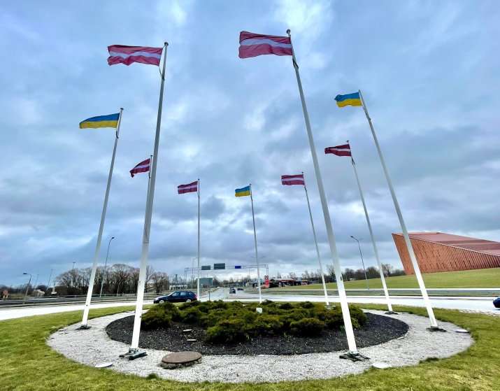 25. februārī, Ventspils valstspilsētas pašvaldībā, paužot atbalstu Ukrainai un tās iedzīvotājiem, arī tilta apļa karogu mastos tika pacelti Ukrainas karogi. Foto: ventasbalss.lv