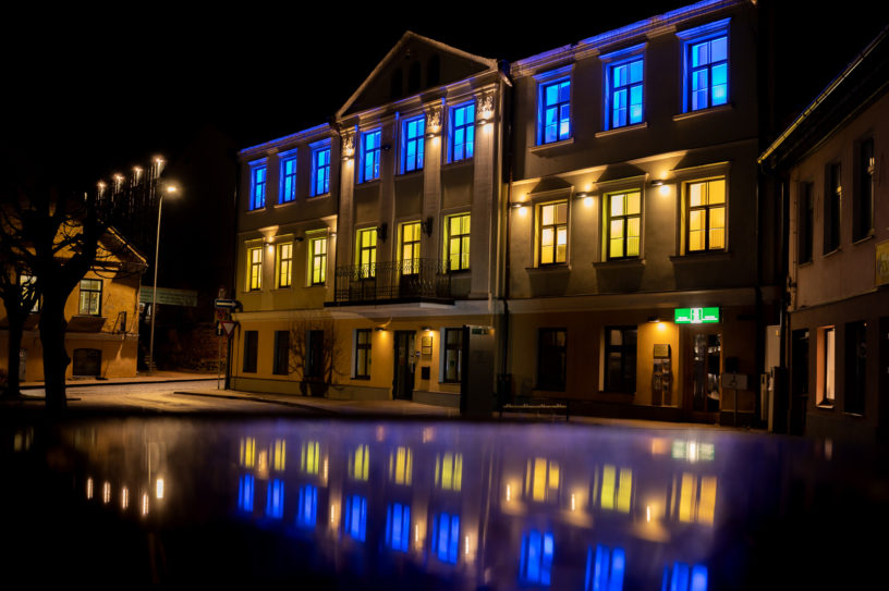 Paužot atbalstu Ukrainas tautai un Saldus novada sadraudzības pilsētai Bahmutai, Saldus novada pašvaldība sadarbībā ar uzņēmēju SIA “ASL Group”,  izgaismo domes ēku Ukrainas karoga krāsās. Foto: saldus.lv