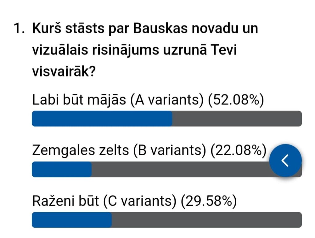 Līdz sestdienas, 21. oktobra, pulksten 12 aptaujā bija piedalījušies 240 iedzīvotāji. Vairākums Bauskas novada iedzīvotāji nobalsojuši par A variantu – Labi būt mājās.