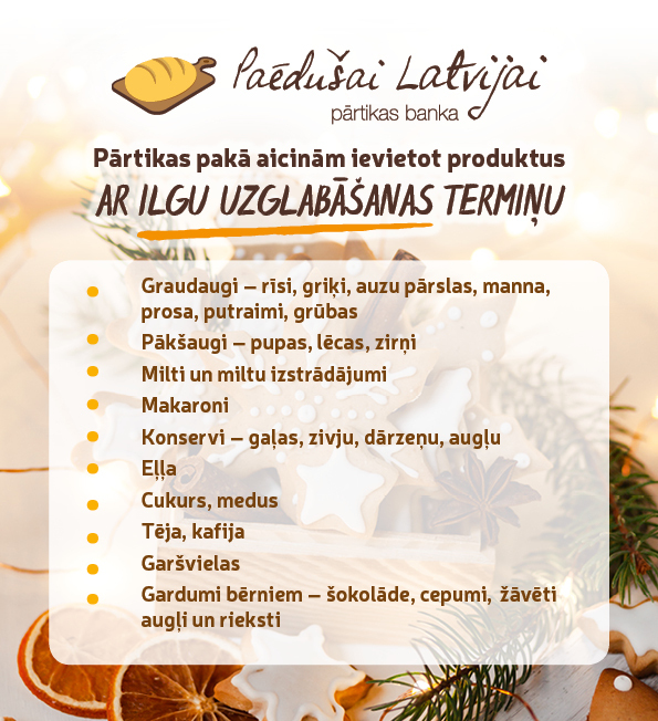 Viņš pastāstīja, ka akcijas laikā ikviens pircējs ir aicināts piepildīt pārtikas pakas, tajās liekot produktus ar garu derīguma termiņu: dažādus graudaugus (rīsus, griķus, mannu, auzu pārslas, prosu, putraimus, grūbas), pākšaugus (pupas, lēcas, zirņus) miltus un miltu izstrādājumus, makaronus, gaļas, zivju, dārzeņu un augļu konservus, eļļu, cukuru, medu, tēju, kafiju, garšvielas, gardumus bērniem – šokolādi, cepumus, žāvētus augļus un riekstus.