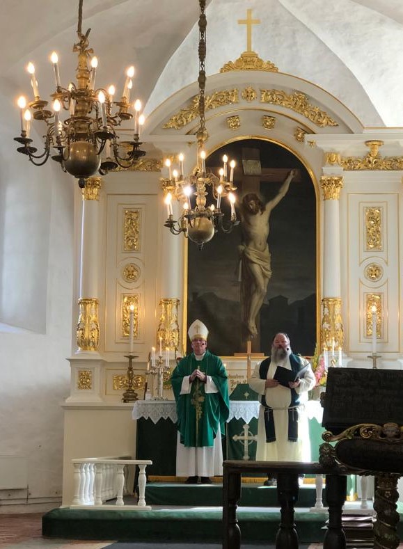 Liepājas diecēzes, pie kuras pieder arī Bauskas iecirknis, bīskaps Hanss Martins Jensons amatā ir konsekrēts kopš 2016. gada 6. augusta. Dzimis 1968. gada 11. jūlijā Zviedrijā, ordinēts 2003. gada 9. jūnijā Rīgas Domā. 1994. gadā absolvējis Lundas Universitātes Teoloģijas fakultāti. 2016. gadā ieguvis Latvijas pilsonību. Bīskaps novērtēja atjaunoto altāra retablu, minot baltā, gaišā altāra kontrastu ar tumšo altārgleznu, kurā Jēzus krustā – viņa sāpes, ciešanas, upuri cilvēcei, ko apstaro gaisma. Kā min teologi, altāri ar laiku kļuvuši par tādu kā starpnieku starp cilvēku un Dievu. Altāris palīdz saprast pazemību un ir kā simbols, kas palīdz koncentrēties uz garīgām lietām.