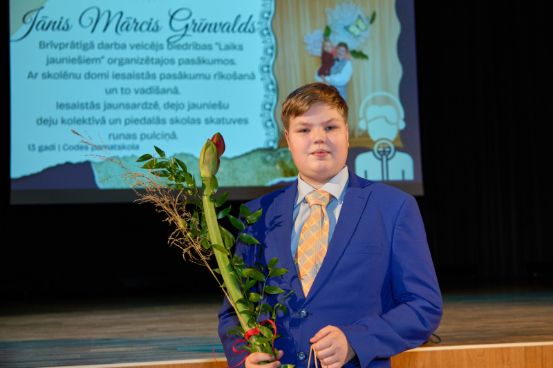 Jānis ir Codes pamatskolas lepnums – līderis, organizators un brīvprātīgais ar neizsīkstošu enerģiju. Viņš aktīvi organizē un vada pasākumus, piemēram, “POPiela” un Helovīna aktivitātes. Jānis izceļas gan STEM priekšmetos, gan runas mākslas sacensībās, kā arī ir pazīstams ar labdarības aktivitātēm Codes un Mežotnes vientuļo senioru atbalstam.