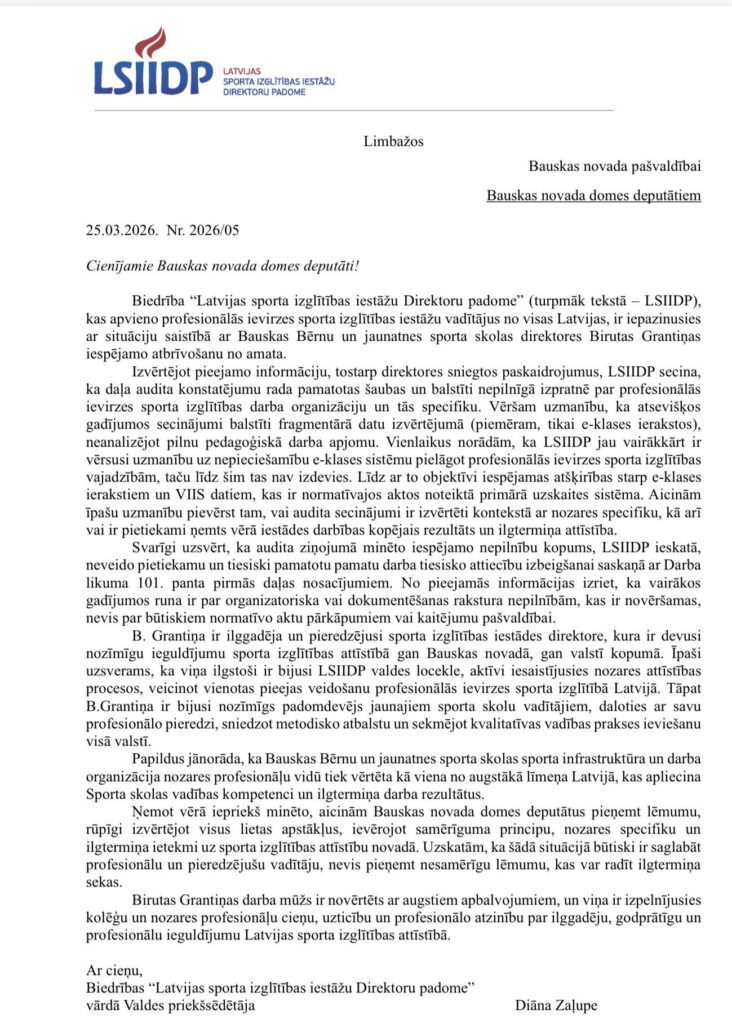 Pirms domes sēdes sarunā ar «Bauskas Dzīvi» B. Grantiņa uzsvēra, ka ar audita rezultātiem ir iepazīstināta un skaidrojumu uzrakstījusi uz 11 lapām, bet tiešas komunikācijas ar pašvaldības vadību nav bijis. «Uzskatu, ka audita ziņojums nav objektīvs. Nav ņemta vērā iestādes sniegtā un dokumentāri pamatotā informācija. Secinājumi balstīti nozares specifikas un normatīvā regulējuma nepilnīgā izpratnē. Jau pirms audita sākšanas man 2025. gada 9. oktobrī piedāvāja izbeigt darba tiesiskās attiecības uz vienošanās pamata. Atkārtoti man šis piedāvājums izteikts gan šī gada 10. martā, gan 17. martā, kas rada pamatotas šaubas par procesa mērķi un objektivitāti,» pauž B. Grantiņa.