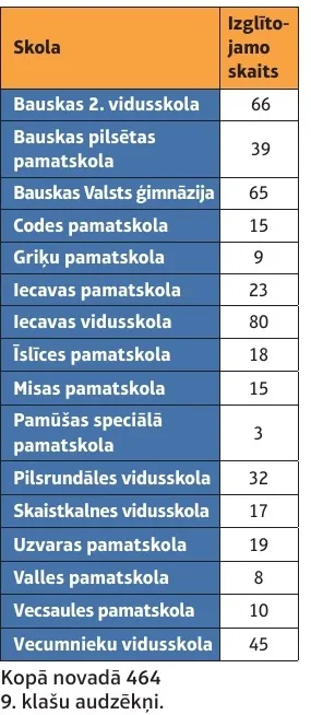 No Bauskas novada skolām Valsts pārbaudījumu informācijas sistēmā pieteiktais 9. klašu skolēnu skaits, kas kārto centralizētos eksāmenus: