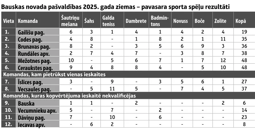 Par pirmās vietas īpašnieku šogad lielu šaubu nav – Gailīšu pagastu apsteigt neizdosies. Viņiem uzvaras galda tenisā un badmintonā, bočē otrā vieta un šahā trešā vieta. Tuvu godalgām Gailīšu pārstāvji bija arī dambretē, novusā un zolītes turnīrā. Tā vēstīts sociālo tīklu kontā «Sports Bauskas novadā».