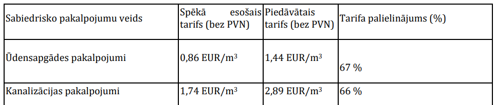 SIA “Dzīvokļu komunālā saimniecība” apstiprināšanai SPRK iesniegusi ūdensapgādes pakalpojumu tarifu 1,44 EUR/m3 un kanalizācijas pakalpojumu tarifu – 2,89 EUR/m3. Salīdzinot ar šobrīd spēkā esošajiem tarifiem, ūdensapgādes pakalpojumu tarifu plānots palielināt par 67% jeb 0,58 eiro, bet kanalizācijas – par 66% jeb 1,15 eiro. Tarifi norādīti bez pievienotās vērtības nodokļa.