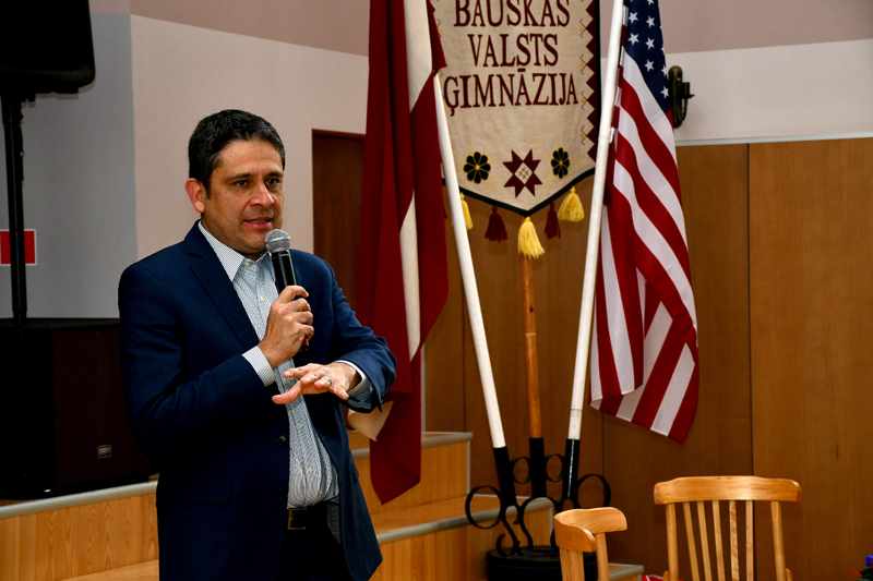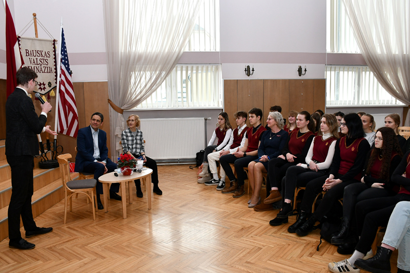 Oskars Avila iepazīstināja ģimnāzistus ar skolēnu programmu jauniešiem vecumā no 16 līdz 18 gadiem. Tā ir iespēja uz četrām nedēļām vasarā doties uz Amerikas Savienotajām Valstīm. Mācīties, gūt jaunu pieredzi, turklāt bez maksas. Vienreizēja iespēja. «Mēs ļoti priecātos tur redzēt kādu no jums, skolēnu no Bauskas. Apdomājiet, es būšu priecīgs atbildēt uz jebkādiem jautājumiem par šo programmu!» auditoriju iedrošināja ASV vēstniecības pārstāvis.