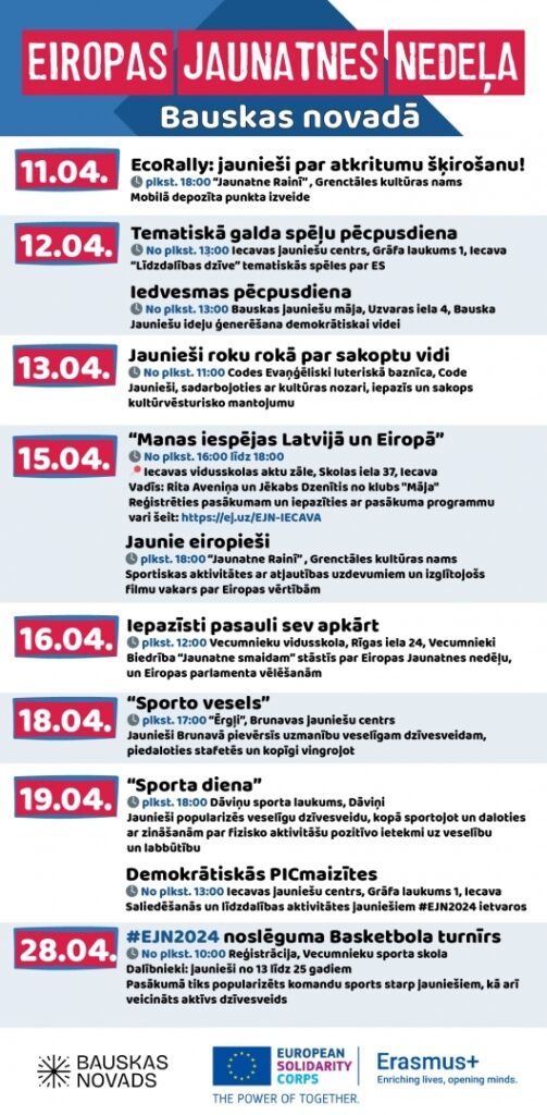 Aprīlī Latvijas reģionos notiks pasākumi, ko organizē gan JSPA, gan Eiropas jaunatnes informācijas tīkls “Eurodesk”, gan citas organizācijas. Patlaban aktivitāšu kartē reģistrēti vairāk nekā 30 pasākumi – debates, pārgājieni, vēlēšanu simulācijas, darbnīcas, lekcijas un viktorīnas.