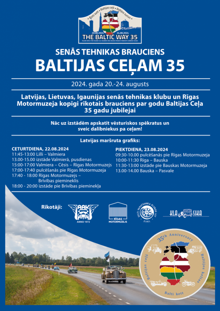 Antīkās tehnikas entuziasti no Igaunijas, Latvijas un Lietuvas atzīmē Baltijas ceļa 35 gadus ar kopīgu seno spēkratu braucienu Baltijas ceļa maršrutā. Brauciena mērķis ir saliedēt mūsu tautas un iepazīstināt ar automašīnām un motocikliem, kas tika izmantoti Baltijas ceļa un Molotova-Ribentropa pakta (MRP) parakstīšanas laikā 1939. gada 23. augustā, kas bija Baltijas ceļa motīvs, vēsta Andrejs Beļinskis, Rīgas motormuzeja vadītāja vietnieks.