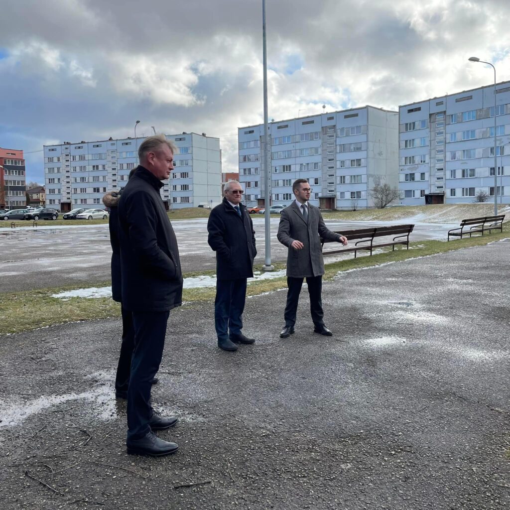 Bauskas novada domes priekšsēdētājs Aivars Okmanis (vidū), priekšsēdētāja vietnieks Aivars Mačeks un VARAM ministrs Artūrs Toms Plešs šī gada sākumā aplūkoja daudzdzīvokļu namu iekšpagalmu. Foto: no albuma.