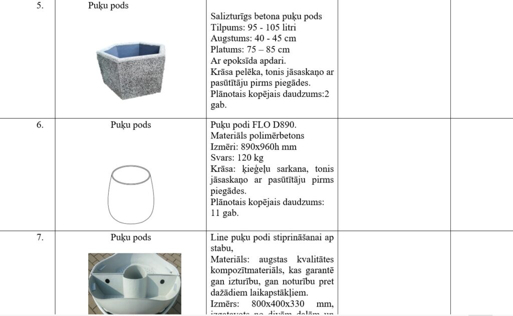Tāpat iecerēts pirkt divus salizturīgus betona puķu podus, kā arī vienpadsmit polimērbetona puķu podus ķieģeļu sarkanā krāsā. Papildus tam iecerēts iegādāties divus puķu podus, kas stiprināmi pie apgaismojuma stabiem un trīs lielizmēra betona puķu podus ar priedes koka soliņiem apkārt perimetrā.