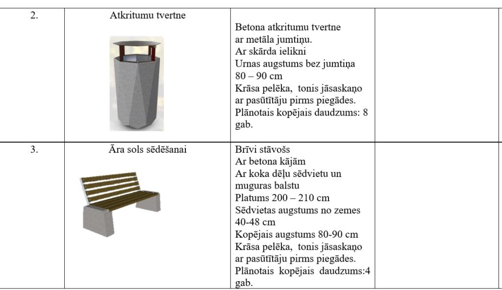 Plānots iegādāties arī āra solus. Brīvi stāvoši soli ar betona kājām un koka sēdvietu ar muguras balstu paredzēti četros eksemplāros, bet vienkārši soli ar metāla kājām un koka sēdvietu – divos eksemplāros.