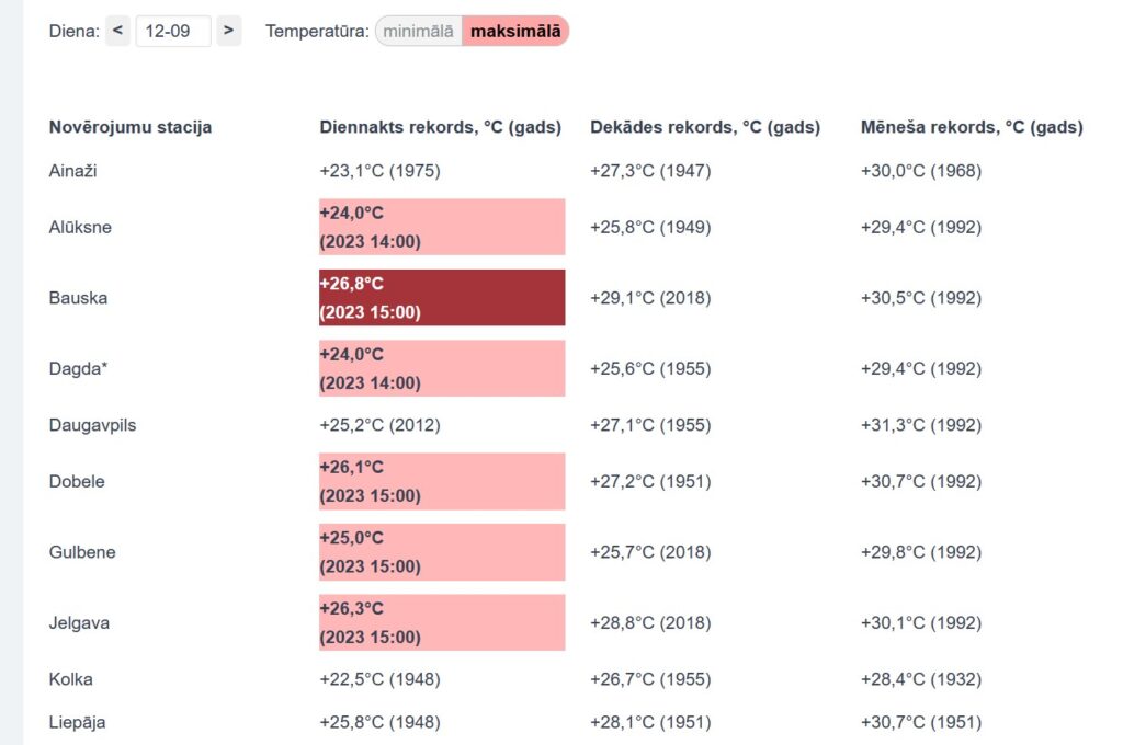 Iepriekšējā augstākā gaisa temperatūra, kas Latvijas teritorijā reģistrēta 12.septembrī, bija +26,4 grādi 1948.gadā Pāvilostā. Bauskā līdzšinējais 12. septembra karstuma rekords fiksēts 1969.gadā +24,8 grādi. Vissiltākā septembra diena Bauskā bijusi 1992. gada 1. septembrī, kad mūsu pilsētā termometra stabiņš pakāpies līdz plus 30,5 grādu atzīmei.