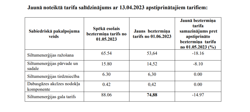 Jaunais uzņēmuma noteiktais tarifs no 1.maija sasniegs 88,06 eiro par megavatstundu (MWh) bez pievienotās vērtības nodokļa. Kopējais tarifa samazinājums ir 22,92 eiro par MWh jeb 20,65%. Tarifa izmaiņas ir saistītas ar šķeldas cenas pārskatīšanu un jauna dabasgāzes piegādes līguma slēgšanu.