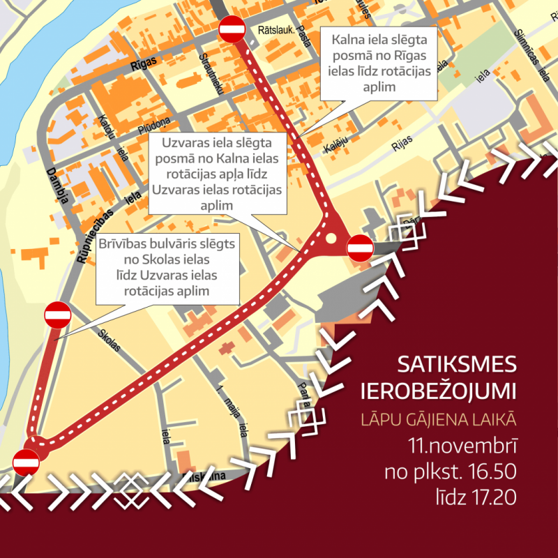 Autovadītājiem jāņem vērā, ka gājiena maršrutā tā norises laikā būs slēgta satiksme Brīvības bulvārī no Skolas līdz Uzvaras ielas satiksmes rotācijas aplim, Uzvaras ielā, kā arī Kalna iela posmā no Rīgas ielas līdz Kalna ielas satiksmes rotācijas aplim.
