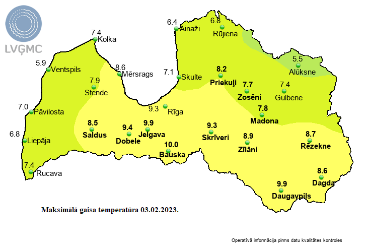 Naktī uz otrdienu gaisa temperatūra valsts lielākajā daļā paaugstinājās līdz +6..+10 grādiem, pārspējot siltuma rekordus, liecina Latvijas Vides, ģeoloģijas un meteoroloģijas centra (LVĢMC) dati.