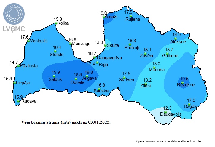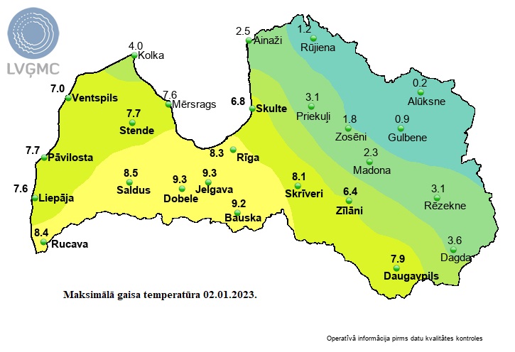 Pirms pusnakts gaisa temperatūra Bauskā pakāpās līdz +9,2 grādu atzīmei, pārspējot 1992.gada 2.janvārī sasniegtos +7,2 grādus. Kopumā valstī 14 meteoroloģiskajās stacijās pārspēts 2.janvāra rekords, tai skaitā labots arī visas valsts rekords – 2007.gada 2.janvārī Rucavā reģistrētie +8,2 grādi.
