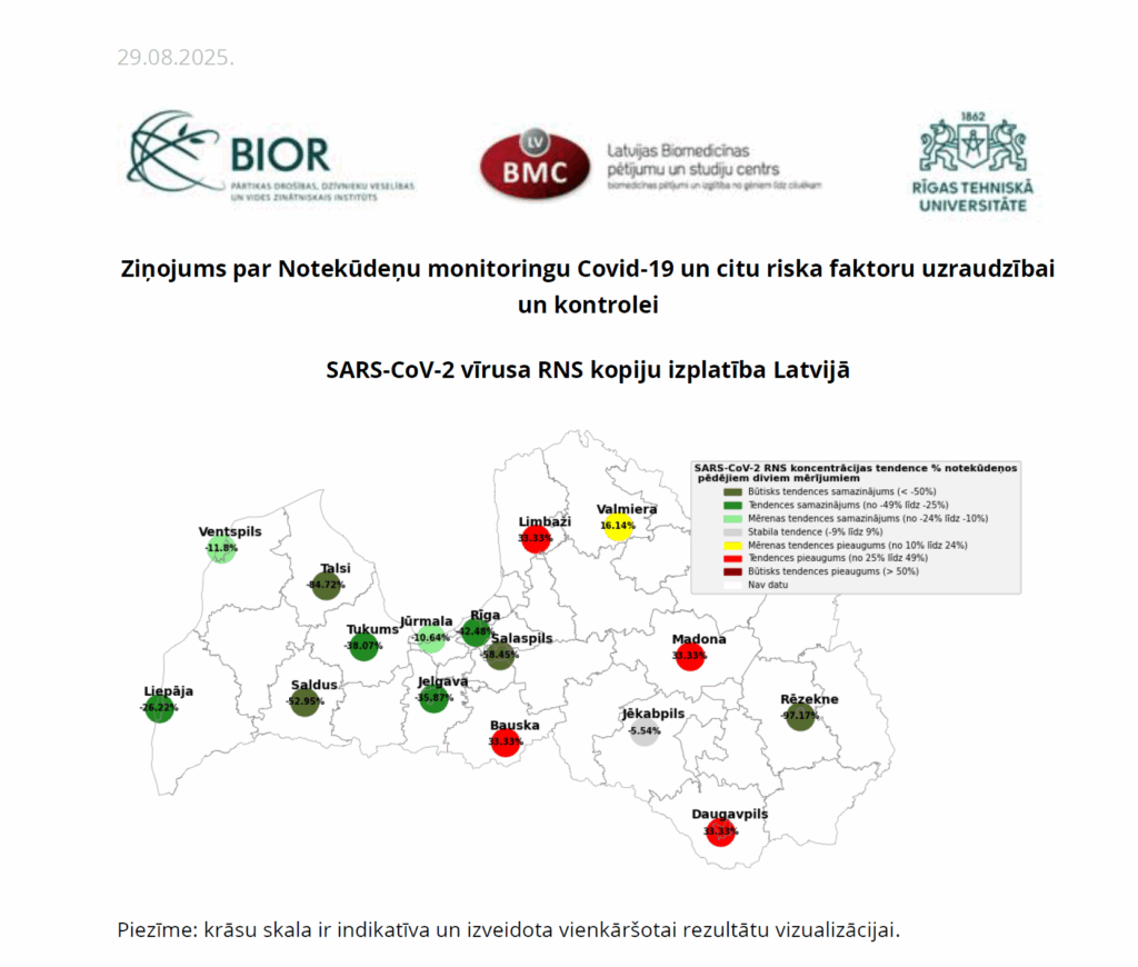 Vienlaikus augustā ziņots arī par trīs nāves gadījumiem pacientiem ar apstiprinātu Covid-19 infekciju. Par SARS-CoV-2 vīrusa cirkulācijas intensitātes pieaugumu vasaras beigās liecina arī notekūdeņu monitoringa rezultāti.