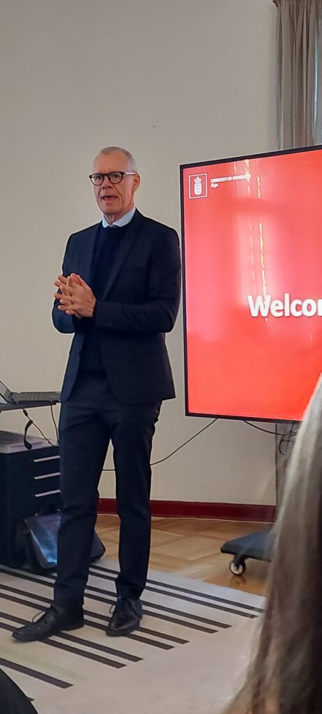 Diplomātiskās misijas vadītāja vietnieks Aleksandrs Lemče stāstīja par Dānijas diplomātu darbību Latvijā kopš Latvijas neatkarības atjaunošanas un turpināja par Eiropas Parlamenta, Eiropas Komisiju un ES padomes darbību un Latvijas un Dānijas sadarbību šajās organizācijās. Aizsardzības atašejs Visti Salomonsens runāja par Dānijas iesaisti Latvijas un visu Baltijas valstu drošības nostiprināšanā, ņemot vērā šobrīdējo ģeopolitisko situāciju. Minēja nākotnes plānus, finansējumu un atbalstu arī no citām Eiropas valstīm.
