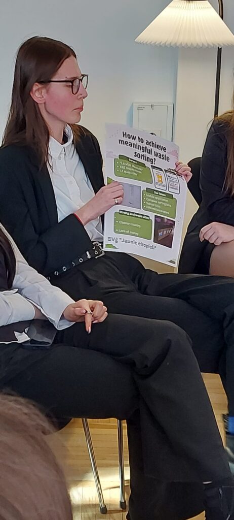 Pēc oficiālās daļas sākās skolēnu rakstīto projektu prezentēšana. Kopā pasākumā piedalījās četras skolas, kura katra stāstīja par savu projektu. Bauskas Valsts ģimnāzijas skolēni prezentēja projektu par atkritumu šķirošanu, kā to popularizēt un uzlabot. Skolēni runāja par veikto aptauju un idejām praktiskajam darbam. Prezentācijas beigās no diplomātu puses tika uzdoti arī jautājumi un veidojās diskusija mūsu starpā.