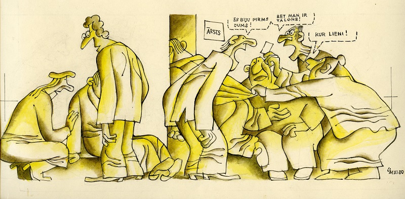 Titulattēlā izmantota U. Mežavilka karikatūra no Bauskas muzeja krājuma: “Cilvēkam kļuvis slikti, vajadzētu izsaukt ātro palīdzību!” Zīmējums publicēts žurnālā “Dadzis” Nr.23. 1980. gads. Papīrs, tuša, akvarelis. 15×33 cm.