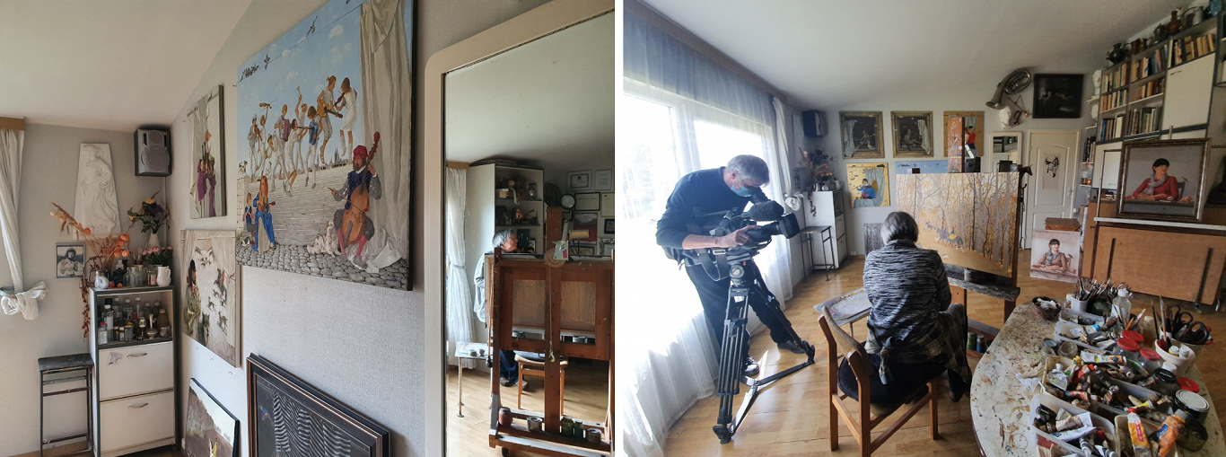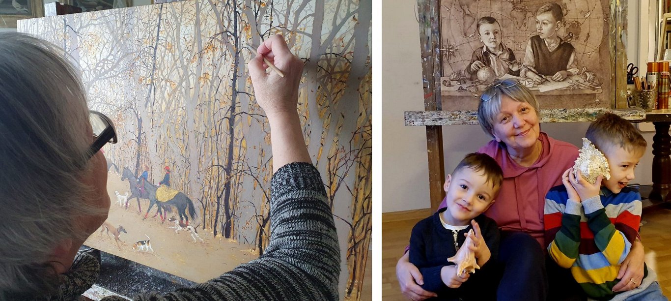 Pa kreisi – Tatjana Paļčuka-Rikāne gleznojot. Pa labi – mazbērni dzīvē un dubultportretā.Foto: Dace Kokle/Pēteris Rikāns