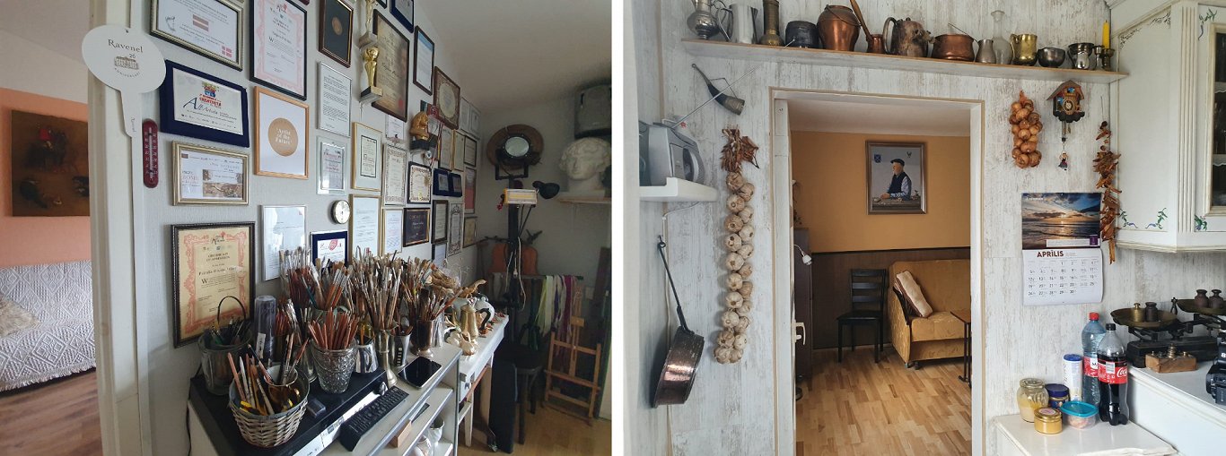 Tatjana smejoties rāda ”goda plāksni” – vesela siena darbnīcā atvēlēta diplomiem un Goda rakstiem par dažādiem starptautiskiem sasniegumiem: “Tas jau viss ir Pētera nopelns, es jau tikai te sēžu un gleznoju savā nodabā – viss lielākais smagums ir uz viņa pleciem.”