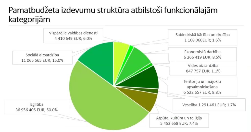 Bauskas novada domes janvāra sēdēs apspriestā 2022. gada budžeta projekta izdevumu struktūra atbilstoši funkcionālajām kategorijām. Foto: ekrānšāviņš no prezentācijas.