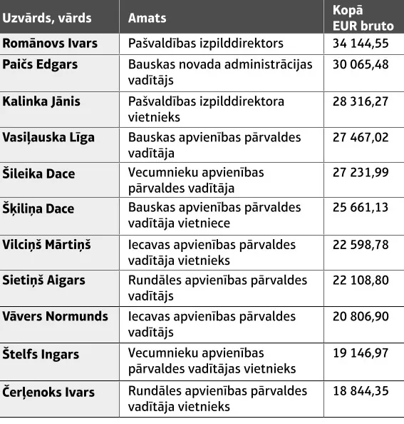 Līdz ar apvienību pārvalžu vadītājiem un vietniekiem amatpersonu sarakstā iekļauta Rundāles apvienības pārvaldes ekustamā īpašuma nodaļas vadītāja Dace Neiberte ar 16 029,79 eiro kopējo atalgojumu pērn desmit mēnešos, kā arī četri nodokļu inspektori: Bauskas apvienības pārvaldē Ineta Šķirmante pērn saņēmusi 13 487,35 eiro, Zintis Konovs – 13 008,59 eiro, savukārt Iecavas apvienības pārvaldes nodokļu inspektorei Evitai Heidemanei aprēķināti 11 055,47 eiro un nodokļu inspektorei Mārītei Grantiņai-Podiņai – 10 462,09 eiro.
