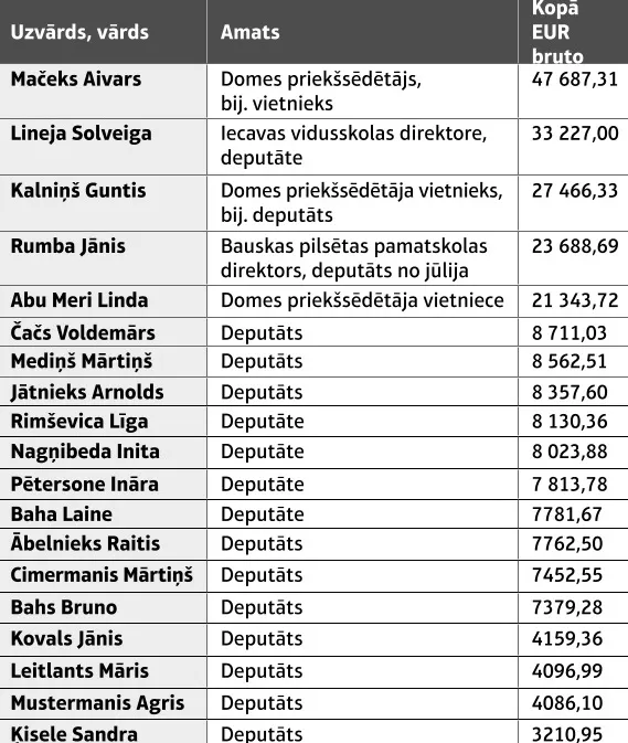 Viņu vidū visvairāk kopsummā saņēma bijušais domes priekšsēdētājs Aivars Okmanis – 23 704,56 eiro pirms nodokļu nomaksas. Deputātam Jānim Siugalim atalgojums Bauskas novada domē pērn pirmajā pusgadā bija 5440,05 eiro, deputātam Jurim Krievam – 4151,82 eiro, Rihardam Melgailim – 3975,91 eiro, Jānim Kalniņam – 3897,14 eiro, Vilnim Gailumam – 3883,37 eiro.