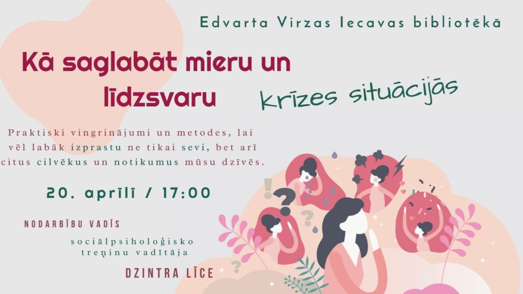 «Mums 20.aprīlī ir paredzēts viens pasākums jeb praktiska nodarbība, ko organizējam apmeklētājiem, «Kā saglabāt mieru un līdzsvaru krīzes situācijās». Ar to strādās mūsu lasītāja, sociālpsiholoģisko treniņu vadītāja Dzintra Līce,» «Bauskas Dzīvi» informē Edvarta Virzas Iecavas bibliotēkas vadītāja Aiva Avota-Zalstere. Trešdien aicināti visi interesenti.