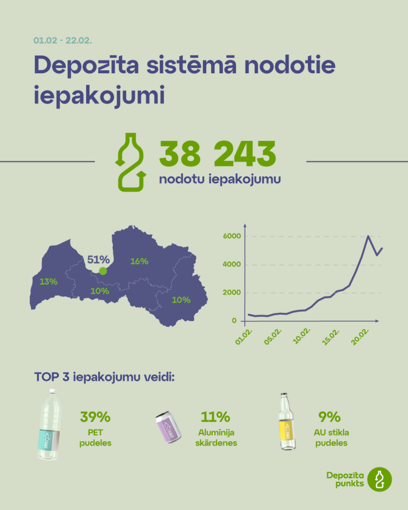 Latvijas iedzīvotāji depozīta punktos līdz 22.februārim nodevuši 38 243 tukšos dzērienu iepakojumus, portālu informēja uzņēmuma SIA “Depozīta iepakojuma operators” pārstāve Dārta Katrīne Salna. Viņa atklāja, ka Bauskas novadā līdz šim nodots 671 depozīta iepakojums.