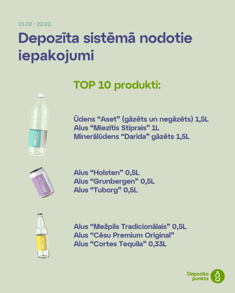 Depozīta punktos līdz šim nodots iepakojums, kurā bija iepildīti 43 dzērienu ražotāju 268 dažādi produkti, lielāko apjomu veidojot dzeramajam ūdenim, alum un dažādiem bezalkoholiskajiem dzērieniem.