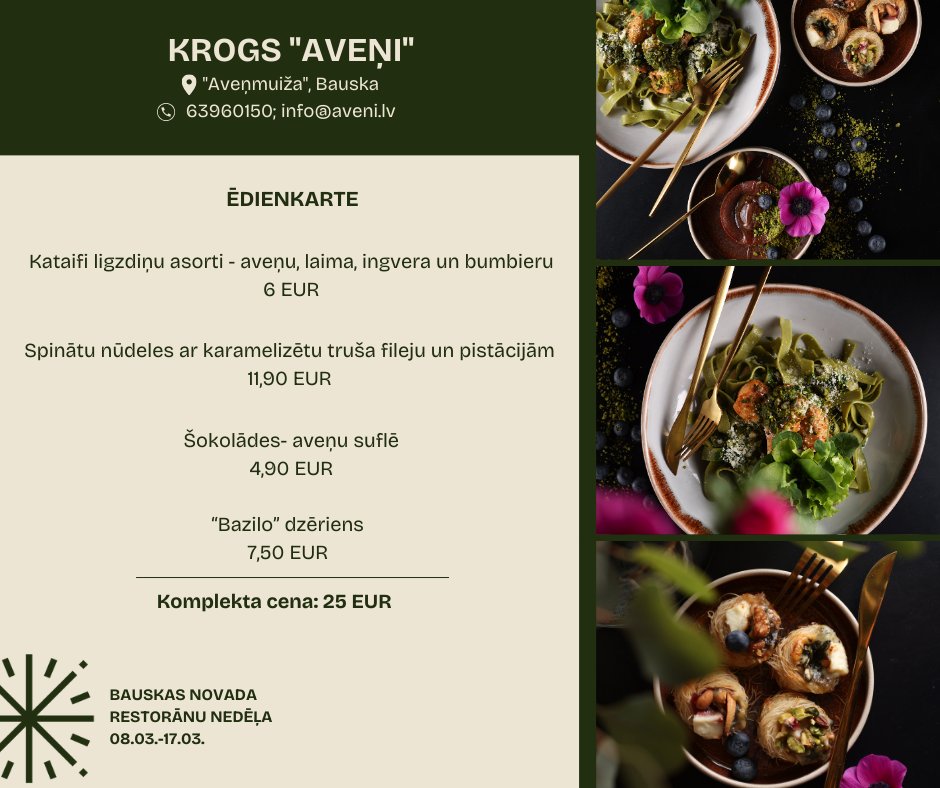 Bauskas krogs “Aveņi” gardēžiem restorānu nedēļā ļaus nobaudīt kataifi ligzdiņu asortus, spinātu nūdeles ar karamelizētu truša fileju un pistācijām, kā arī šokolādes-aveņu suflē, kā arī “Bazilo” dzērienu. Ēdienu komplekta cena te būs 25 eiro.