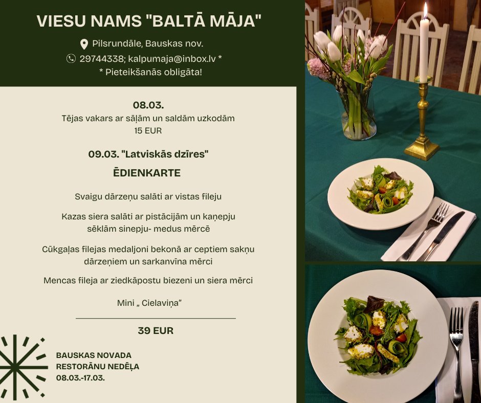 Viesu nams “Baltā māja” Rundāles pagastā sarūpējis divus piedāvājumus. Sieviešu dienā te ieplānots tējas vakars ar sāļām un saldām uzkodām, bet no 9. marta gardēži “Baltajā mājā” gaidīti uz “Latviskām dzīrēm”. Varēs baudīt svaigu dārzeņu salātus ar vistas fileju, kazas siera salātus ar pistācijām un kaņepju sēklām sinepju-medus mērcē, cūkgaļas filejas medaljonus bekonā ar ceptiem sakņu dārzeņiem un sarkanvīna mērci, mencas fileju ar ziedkāpostu biezeni un siera mērci, kā arī mini “Cielaviņu”.
