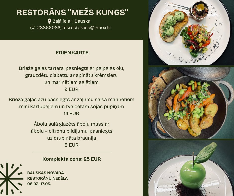 Bauskas restorāna “Mežs Kungs” piedāvājumā iekļauts trīs ēdienu komplekts. “Starterī” pasniegs brieža gaļas tartaru, otrajā ēdienā brieža gaļas azū ar mini kartupelīšiem un tvaicētām sojas pupiņām, bet desertā ābolu sulā glazētu ābolu mussu uz drupināta braunija. Komplekta cena noteikta 25 eiro.