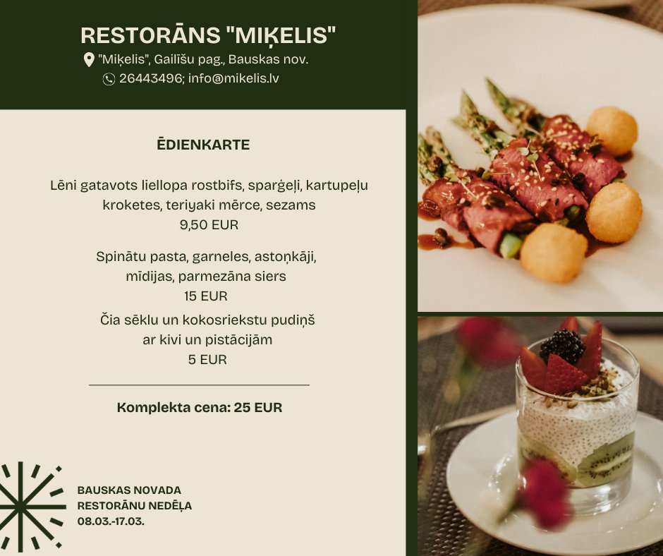 Restorāns “Miķelis” Gailīšu pagastā par 25 eiro aicina nogaršot liellopa rostbifu, spinātu pastu ar jūras veltēm un parmezāna sieru, kā arī čia sēklu un kokosrieksta pudiņu ar kivi un pistācijām.