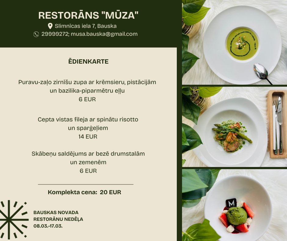 Restorāns “Mūza” sagatavojis patiešām “zaļu pat vēl zaļāku” piedāvājumu. Samaksājot 20 eiro, te garšas kārpiņas varēs palutināt ar puravu-zaļo zirnīšu zupu ar krēmsieru, pistācijām un bazilika-piparmētru eļļu, ceptu vistas fileju ar spinātu risotto un sparģeļiem, kā arī skābeņu saldējumu ar bezē drumstalām un zemenēm.