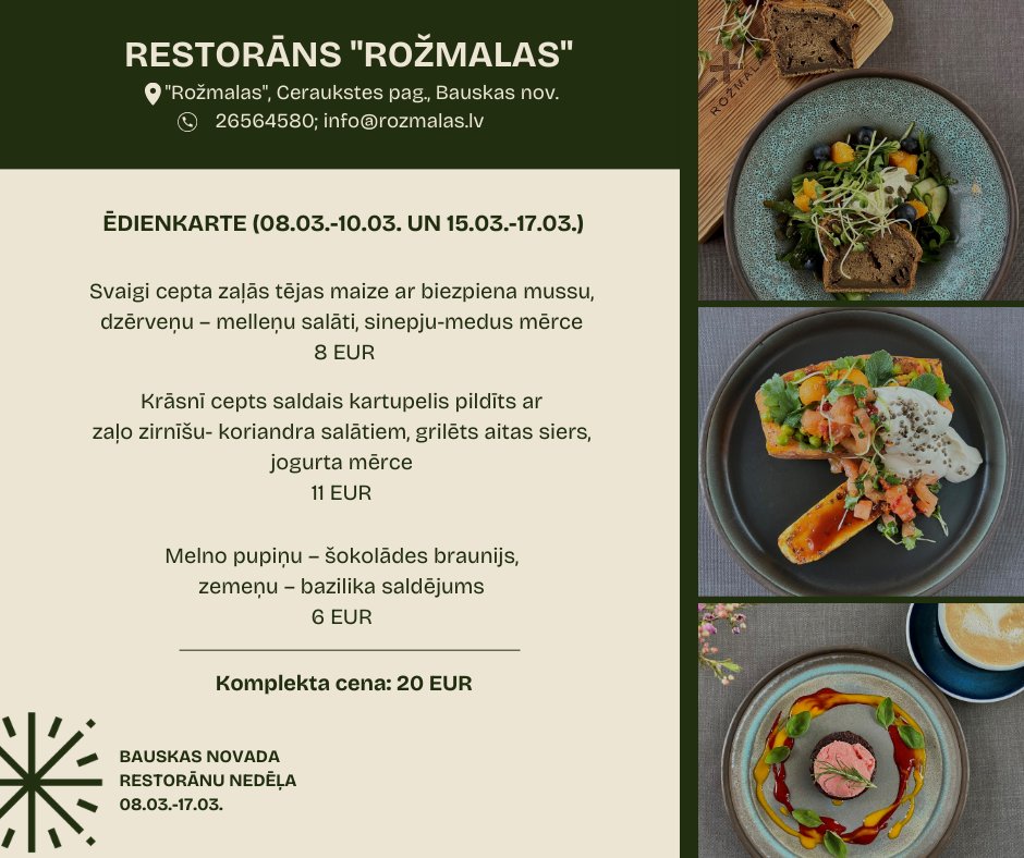 Restorāns “Rožmalas” Ceraukstes pusē aicina noprovēt svaigi ceptu zaļās tējas maizi ar biezpienu mussu, dzērveņu – melleņu salātus sinepju-medus mērcē, krāsnī ceptu saldo kartupeli pildītu ar zaļo zirnīšu-koriandra salātiem un grilētu aitas sieru, kā arī melno pupiņu- šokolādes brauniju pasniegtu ar zemeņu-bazilika saldējumu. Piedāvājuma cena noteikta 20 eiro.