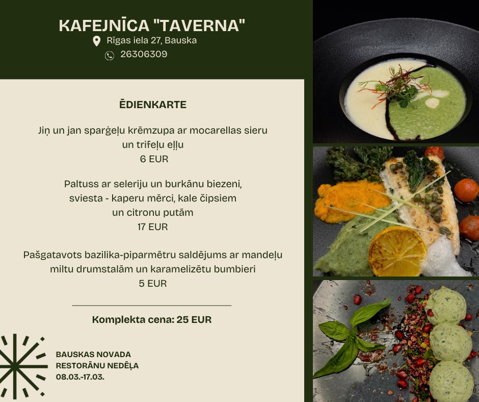 Bauskas kafejnīcā “Taverna” restorānu nedēļas piedāvājums izmaksās 25 eiro. Komplektā iekļauta jiņ un jan sparģeļu krēmzupa ar mocarellas sieru un trifeļu eļļu, paltuss ar seleriju un burkānu biezeni, kā arī pašgatavots bazilika-piparmētru saldējums ar mandeļu miltu drumstalām un karamelizētu bumbieri.