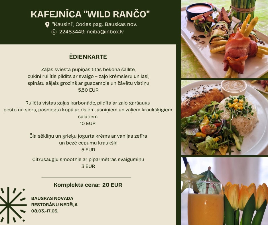 Kafejnīcas “Wild rančo” Codes pagastā trīs kārtu ēdiens izmaksās 20 eiro. Pirmajā ēdienā tiek piedāvāts nobaudīt zaļās sviesta pupiņas tītas bekona šallītē, cukini rullīti pildītu ar krēmsieru un lasi, spinātu sāļo groziņu ar guacamole un kūpinātu vistu. Otrajā ēdienā tiks pasniegta rullēta vistas gaļas karbonāde pildīta ar zaļo garšaugu pesto un piedevās rīsi, kā arī salāti. Desertā – čia sēklu un grieķu jogurta krēms ar vaniļas zefīra un bezē cepumu kraukšķi.
