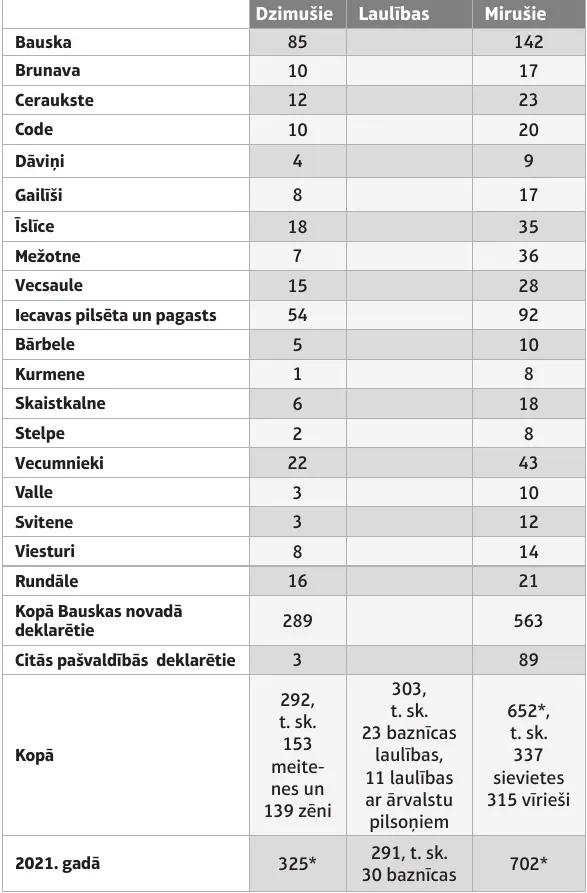 Aizpērnā, 2021., gada demogrāfijas dati liecina, ka Bauskas novadā reģistrēti 325 jaundzimušie, no kuriem 170 meitenes un 155 zēni. Bauskas novada pašvaldības dzimtsarakstu nodaļas vadītāja Sandra Kolberga komentē, ka dzimstība Bauskas novadā, tāpat kā visā valstī, diemžēl samazinās. To apstiprina 2022. gada dati, kuros redzams, ka pērn jaundzimušo skaits Bauskas novadā bija 292 (153 meitenes un 139 zēni), kas ir par 33 jaundzimušajiem mazāk nekā 2021. gadā. Gan 2021. gadā, gan 2022. gadā Bauskas novadā saglabājusies tendence, ka vairāk dzimst meitenītes.