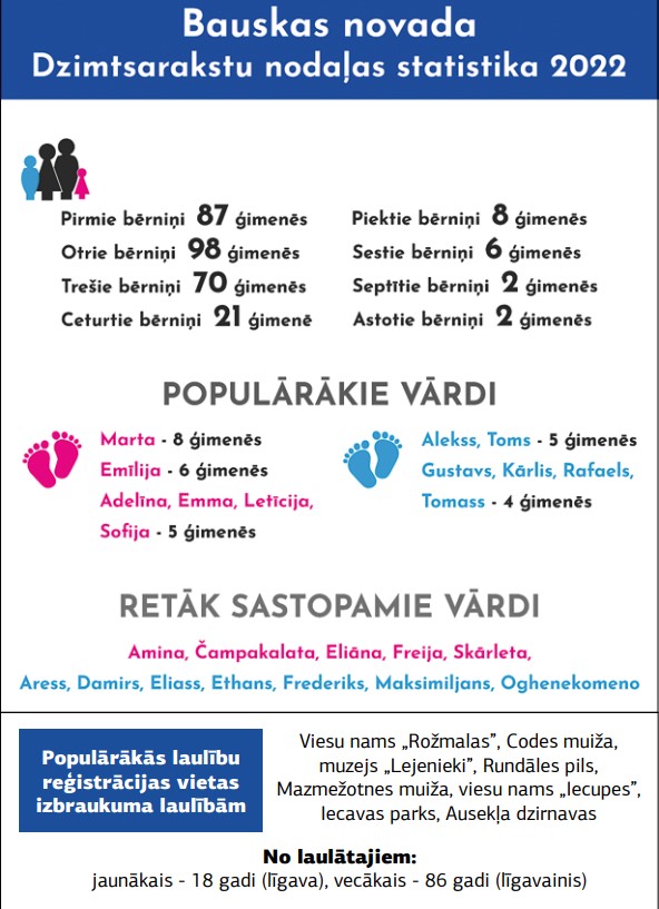 S. Kolberga informē, ka šogad, līdz 18. janvārim, Bauskas novada dzimtsarakstu nodaļā reģistrēti 12 jaundzimušie, no kuriem četri puisīši un astoņas meitenītes. «Vidējais pirmo bērnu māmiņu vecums 2022. gadā bija 26,5 gadi,» stāsta S. Kolberga.